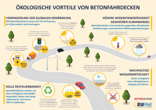 L'infographie de l'EUPAVE (EUROPEAN CONCRETE PAVING ASSOCIATION) sur les avantages écologiques des chaussées en béton montre comment les routes en béton contribuent à la conservation des ressources.